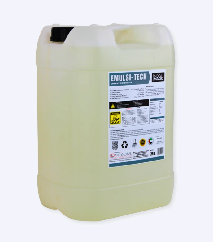 Emulsi-Tech is a concentrated, premium-grade laundry emulsifier formulated to eliminate heavy grease, oil, and industrial soil from fabrics. Specially designed for use in commercial and industrial laundries, it penetrates deep into fibers to emulsify oily residues without damaging fabric integrity.